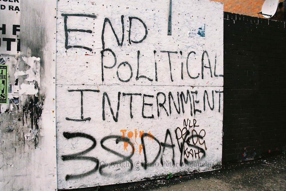 “End political internment – 38 days.” “38 days” is added to the graffiti previously in support Terry McCafferty. The prisoner in question is Martin Corey, member of Republican Sınn Féın and allegedly involved with the CIRA. The graffiti (and RSF stencil) is at the top of the New Lodge Road, Belfast.