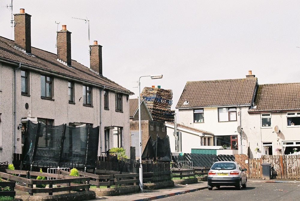 This is the 2010 bonfire in Ballykeel 1, as seen from the edge of Ballykeel 2, with “KAT” [Kill All Taigs] banner and Irish tricolour. It appears to be bigger than “probably the biggest bonfire” in Ballykeel 2.