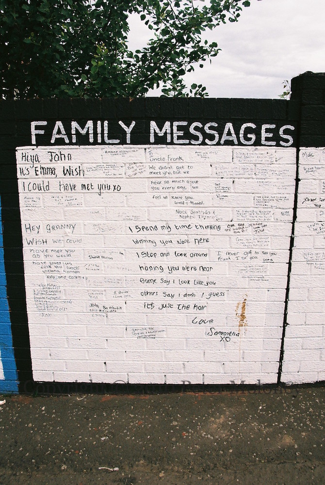 These are 2010 images of the Ballymurphy Massacre panels at the junction of the Springfield and Whiterock roads. The left-most panel, shown second, above, with information about Relatives For Justice, is new compared the early and in-progress shots from 2009. On the gable is Where’s The Joy?