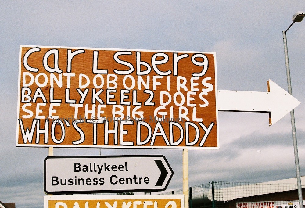 “Carlsberg Don’t Do Bonfires, Ballykeel 2 does. See the big girl. Who’s the daddy.” Ballykeel estate was built in two phases, in 1962 and 1972, with distinctive types of housing that allow them to be easily distinguished (WP) and each has its own bonfire. Carlsberg lager had a popular advertising campaign on the theme of ‘Carlsberg don’t do Xs, but if we did, they would probably be the best Xs in the world.’ See previously in Belfast If Carlsberg Watched Bonfires. For the bonfire itself, see Ballykeel Bonfire.