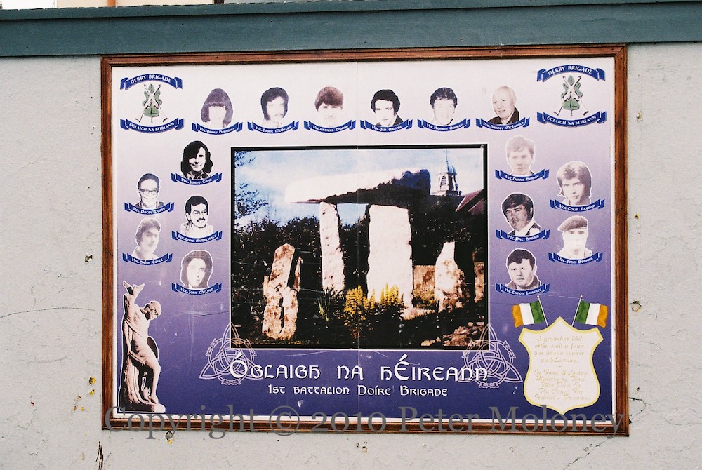 A Derry Brigade IRA board is put next to the 25th anniversary mural of the second hunger strike in Westland Street, Derry. It is the same as the one in the Brandywell.