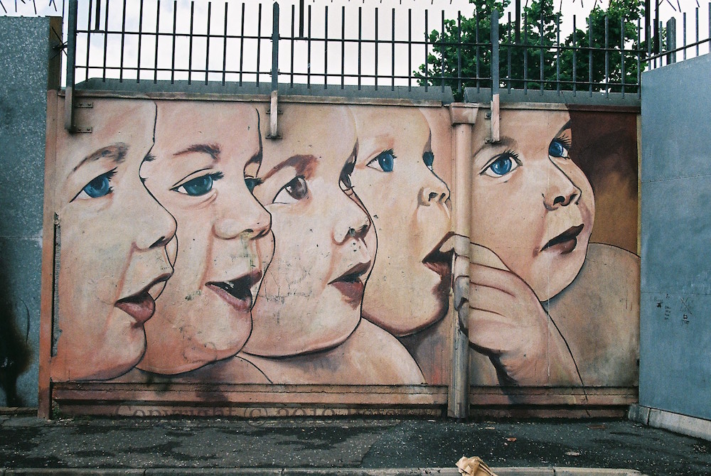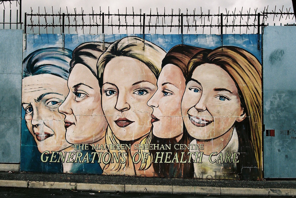 This pair of murals is behind the Maureen Sheehan health centre on Albert Street, Belfast.