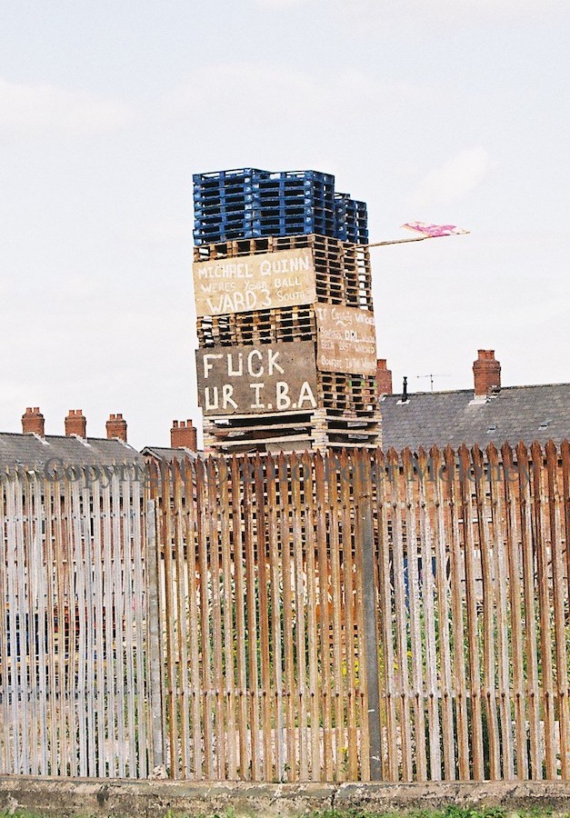 Signage on the 2010 Monach bonfire: “Michael Quinn weres [sic] your ball. Ward 3 South [?of Belfast City hospital?].” “Fuck ur IBA” [a gang of young hoods from CNR St James’s]. And “If Carlsberg watched bonfires, DRL [Dongall Road Loyalists] wuda [“would have”] been [the] best watched bonfire in the world.” There is also a swastika at the bottom. On the night, there was rioting at the site (BelTel).