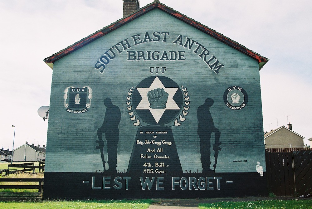 “South East Antrim Brigade UFF. In proud memory of Brig. John “Grugg” Gregg and all fallen comrades. 4th Batt. A B C Coys. Lest we forget.” Gregg is known for the attempted killing of Gerry Adams and for being killed on the orders of Johnny Adair, which led to the expulsion of Adair’s company from the lower Shankill.