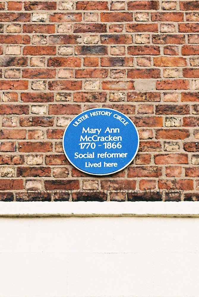 “Mary Ann McCracken 1770-1866, social reformer, lived here [62 Donegall Pass, Belfast]. McCracken ran a muslin business in Belfast and was involved with the Clifton Street poorhouse, worked for the abolition of slavery and the preservation of Irish harp music. United Irishman Henry Joy McCracken was her brother.