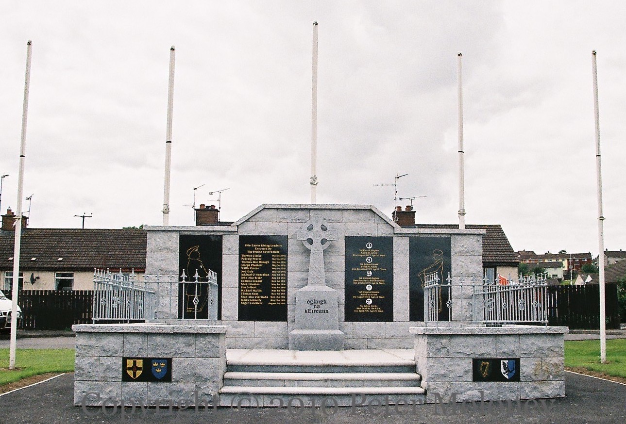 Monument in Newry’s Derrybeg estate. The central panels are to (left) the “1916 Easter Rising leader’s [sic] executed by the British government” and (right) Newry IRA volunteers Patrick Hughes, Edward Grant, Michael Hughes, Brendan Watters, and Colum Marks.