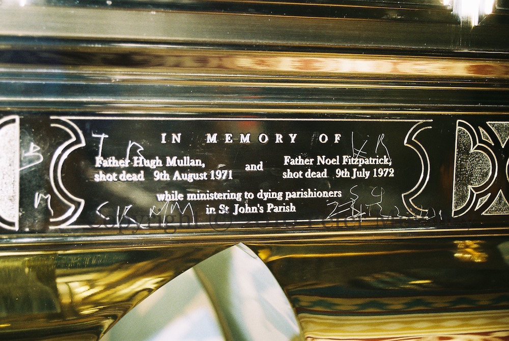 “In memory of Father Hugh Mullan shot dad 9th August 1971 [Ballymurphy Massacre]and Father Noel Fitzpatrick shot dead 9th July 1972 [Springhill-Westrock Massacre] while ministering to dying parishioners in St John’s Parish.” The plaque is inside St Peter’s cathedral in Divis, Belfast.