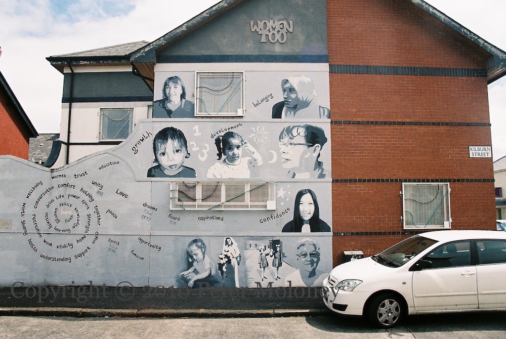 “United Hope – Artist Joanna Vance. Workshops were held in partnership with community representatives, ethnic minorities and members of staff. The project theme was project diversity, allowing women to explore issues such as similarity and difference, ethnicity and race and belonging. After discussions it was decided that the mural should include users of the centre from the community and staff also that it would be completed in black & white with empowering words running through it, as these represent what the centre means to women on a daily basis.”