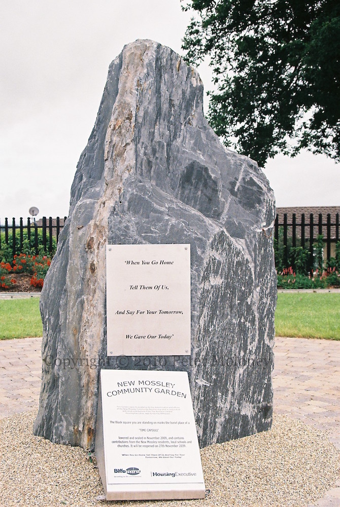 “When you go home/Tell them of us/And say for your tomorrow/We gave our today.” is a WWII epitaph by John Maxwell Edmonds in Kohima Cemetery. It is shown here on a plaque on a stone in New Mossley community garden (also the site of a time capsule).