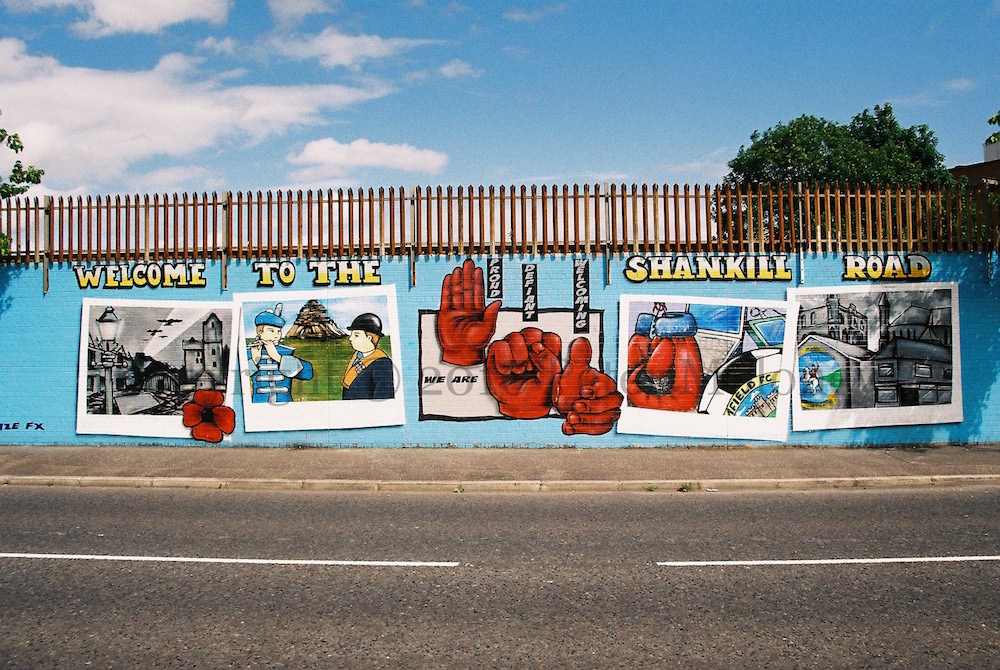 The red hand of Ulster in three configurations: “We are proud, defiant, welcoming.” Mural by Blaze FX depicting polaroids of the blitz, the Twelfth, sports, murals. The location of the mural is designed to be seen by tourists travelling between the so-called International Wall (and Northumberland Street murals) and the Shankill.