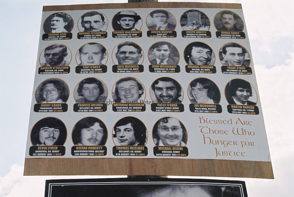 This poster of Irish hunger strikers goes back before Frank Stagg and Michael Gaughan in the 1970s to include Thomas Ashe, Michael Fitzgerald, Terence McSwiney, Joseph Murphy, Joseph Whitty, Dennis Barry, Andrew O’Sullivan, Tony D’Arcy, [Seán] Jack MacNeela, and Sean McCaughey.