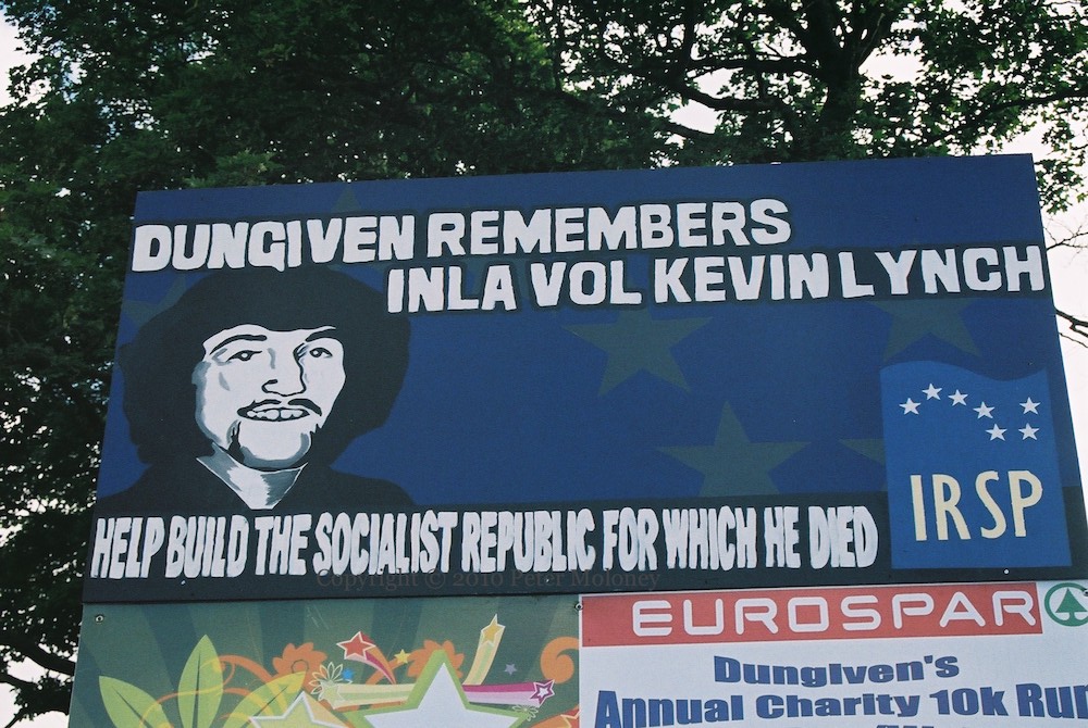 “Dungiven remembers INLA Vol Kevin Lynch. Help build the socialist republic for which he died.” Lynch died after 71 days on hunger strike in 1981. The IRSP was the political wing of the INLA and continues to operate.