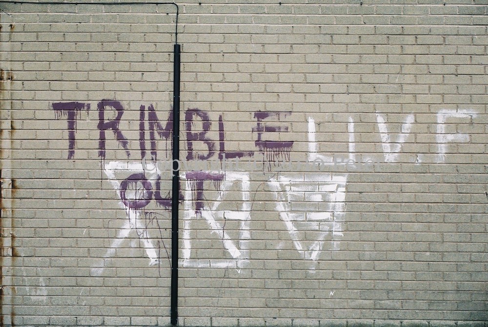 David Trimble was leader of the UUP and first First Minister of the new Assembly. This Ballybeen graffiti might date back to that period (1998-2005), as the issue of IRA decommissioning led to suspensions of the parliament and Trimble’s own (temporary) stepping-down.