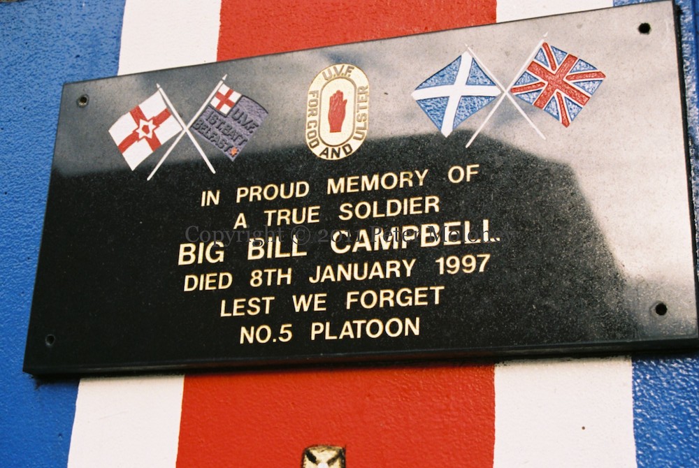 “A true soldier – Big Bill Campbell”, leader of the UVF’s 1st Scottish battalion. Campbell (and Von, to whom a plaque would later be added below Campbell’s) were imprisoned for bombing Glasgow pubs in 1979 and Campbell is suspected of involvement of the McGurk’s Bar bombing in 1971.