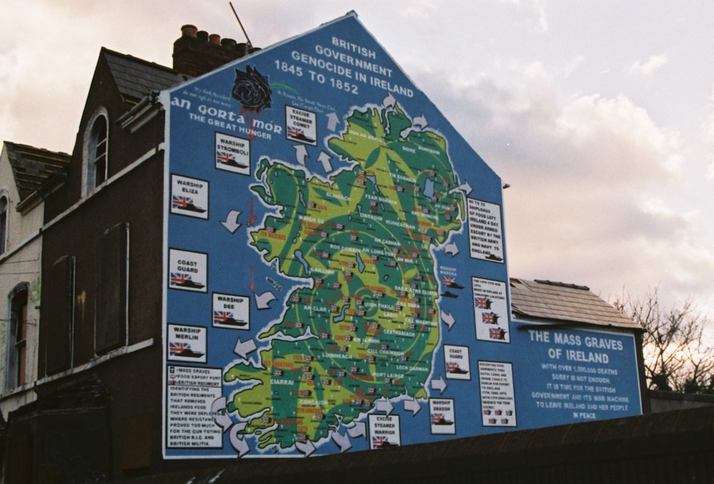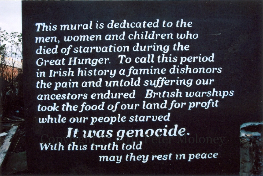 “A Róısín, na bíodh brón ort, fár [fé’r] éırıgh duıt” Each white cross on the map represents a mass grave. The map is originally from irishholocaust.org. An in-progress shot from 2010 can be seen in the Extramural Activity post for this mural.