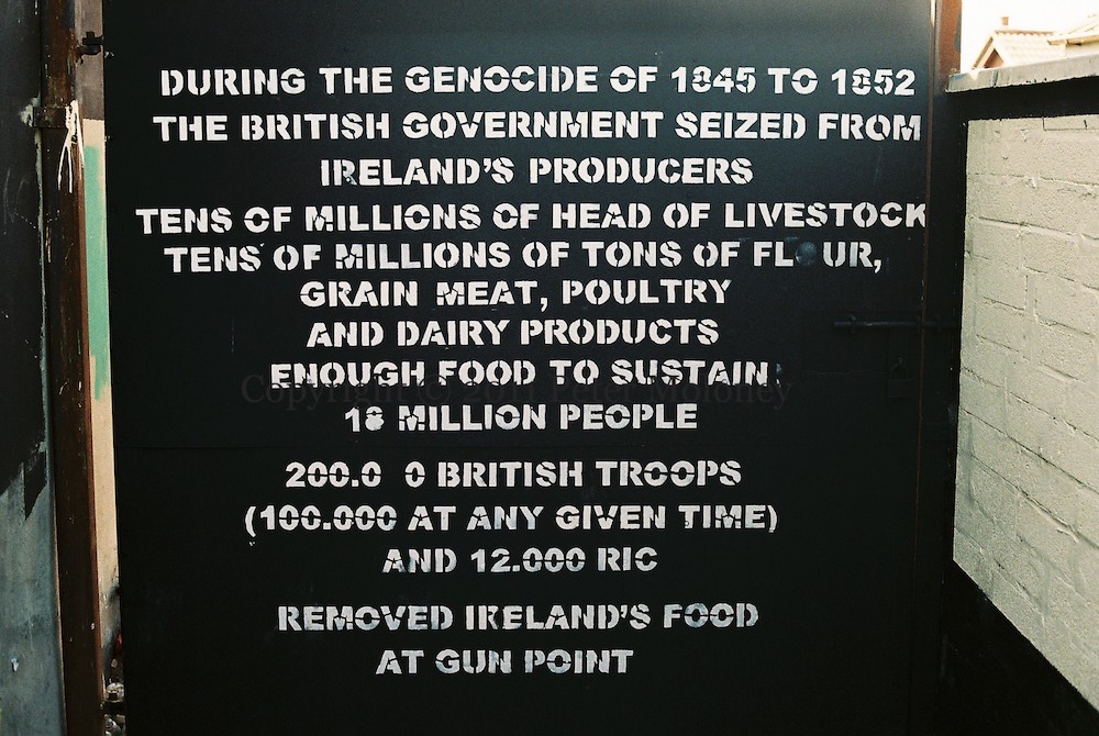 “The Mass Graves Of Ireland – with over 1,500,000 deaths sorry is not enough. It is time for the British government and its war machine to leave Ireland and its people in peace.” “This mural is dedicated to the men, women and children who died of starvation during the Great Hunger [An Gorta Mór]. To call this period in Irish history [1845-1852] a famine dishonors the pain and untold suffering our ancestors endured. British warships took the food of our land for profit while our people starved. It was genocide. With this truth told, may they rest in peace.” “Escorting food shipments thru Royal Canal and Grand Canals to Dublin for export to England 17th, 32nd, 45th, 66th, 13th dragoons (whence the term goons).” “During the genocide of 1845 to 1852 the British government seized from Ireland’s producers tens of million of head of livestock, tens of millions of tons of flour, grain meat, poultry and dairy products enough food to sustain 18 million people. 200,000 British troops (100,000 at any given time) and 12,000 RIC removed Ireland’s food at gunpoint.”