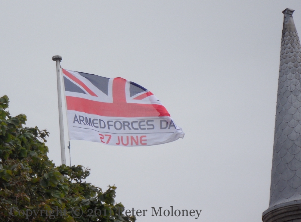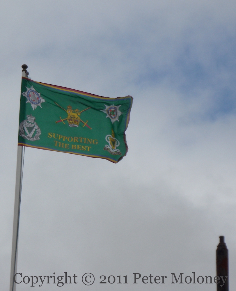 Flags flying over the walls of Derry in support of British forces: above, a call to mark Armed Forces Day on June 27th; below, the insignia of (clockwise) the RIR, Royal Dragoons, Irish Guards, and Queen’s Hussars.