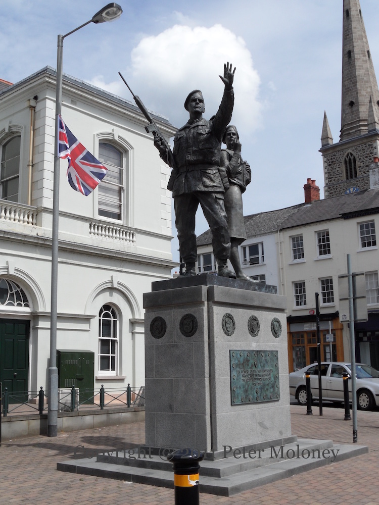 “In memory of the men and women who served in the ranks of the Ulster Defence Regiment 1970-1992”. The statue is by sculptor John Sherlock and was unveiled on June 17th, 2011 (NI World).