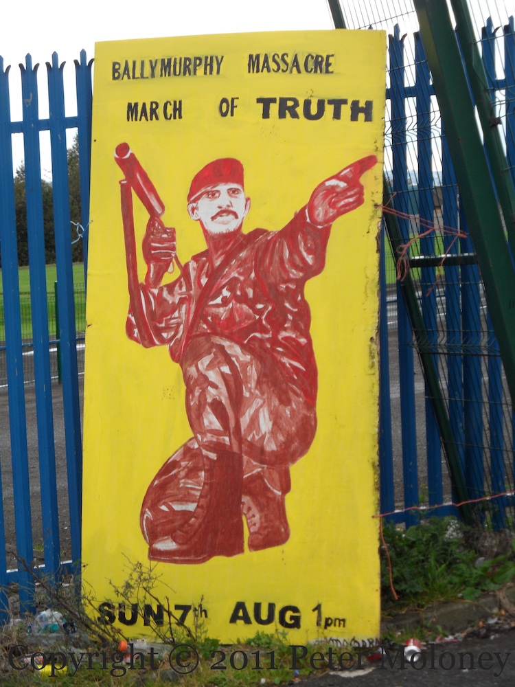 The Ballymurphy Massacre took place at the introduction of internment on August 9th, 1971. 11 people were killed by British Army paratroopers over the course of three days. For more background see Ballymurphy Massacre. 2011 is the 30th anniversary and the campaign for truth and justice continues with a ‘march for truth’. The board in the first image was painted by Mo Chara Kelly. The play advertised in the second image is Ballymurphy – The Aftermath, written by Brenda Murphy, directed by Pam Brighton and playing at Conway Mill.