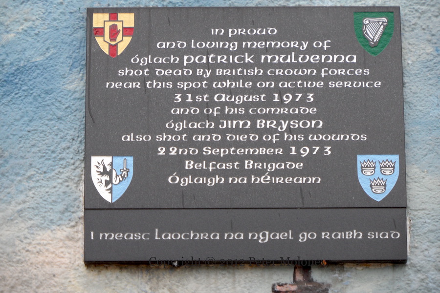 “In proud and loving memory of Óglach Patrick Mulvenna, shot dead by British crown forces near this spot while an active service, 31st August 1973, and of his comrade Óglach Jim Bryson, also shot and died of his wounds, 22nd September 1973. Belfast Brigade Óglaigh na hÉıreann. I measc laoachra na nGael go raıbh sıad.”