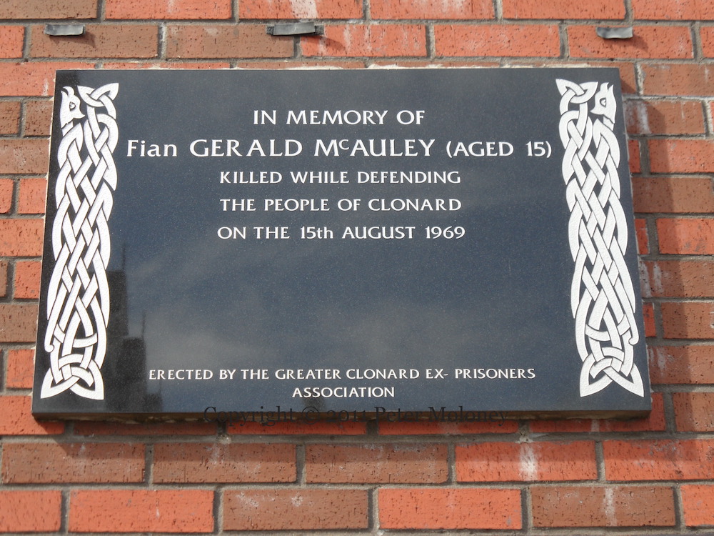 “In memory of Fıan Gerald McAuley (aged 15) killed while defending the people of Clonard on the 15th August 1969. Erected by the Greater Clonard Ex-Prisoners Association.” McAuley was killed during the riots in August 1969 that mark the start of “the Troubles” (An Phoblacht). The plaque is near the spot where he was killed. His portrait was above the No Decommision mural and then in the Never Again mural in Bombay Street.