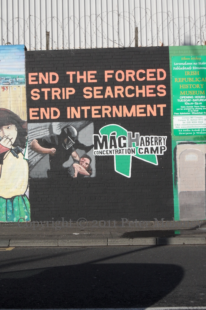 “End forced strip searches, end internment [at] Maghaberry concentration camp”. Republican prisoners are held in the Roe House at Maghaberry. Several republican prisoners (as many as five) are conducting a “dirty protest” in response to conditions and treatment, including integration with loyalist prisoners (Irish Echo | BBC). The green ribbon as an emblem goes back to the campaign after the ceasefire to release POWs – here is a mural from 1995.