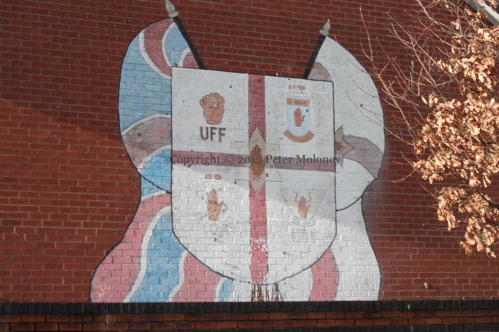 It’s not clear how long this mural has been in place (possibly 1994 or earlier), but this is a design (four wings of the UDA in the quadrants of an Ulster Banner shield) with a long heritage – see 1988 in the Fountain, Londonderry, 1990 in the Waterside, Londonderry, 1988 variation in Belfast.