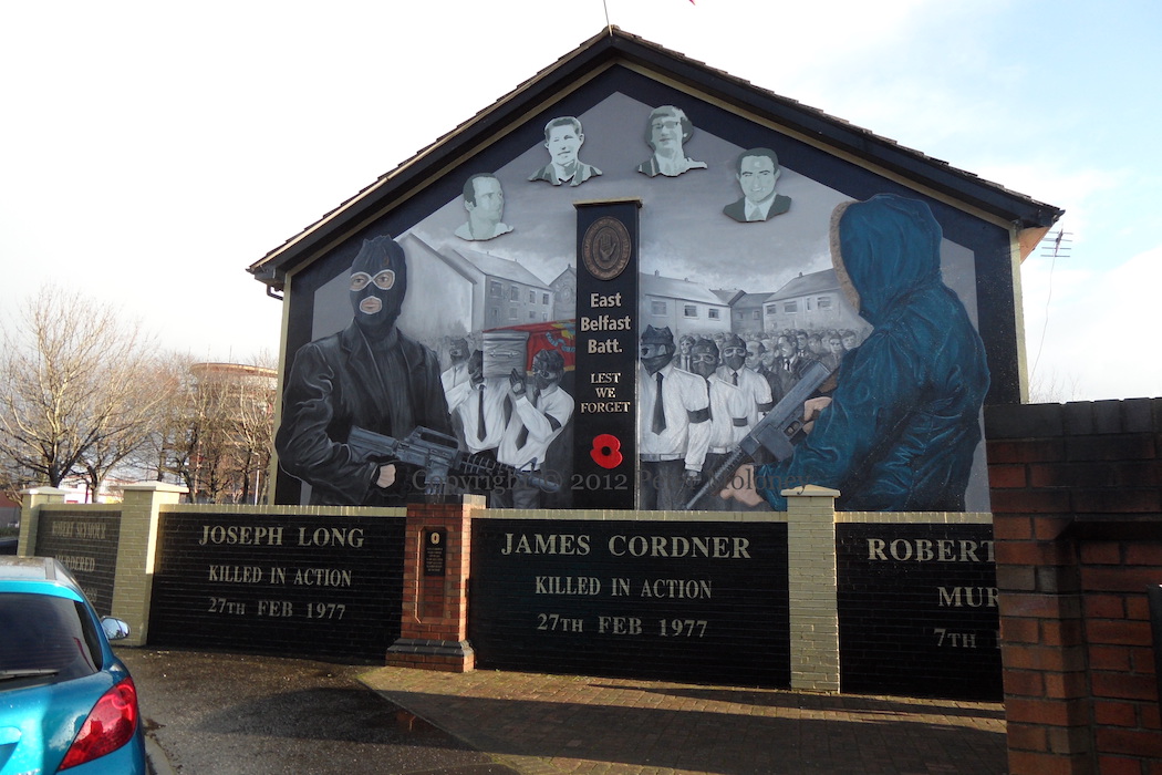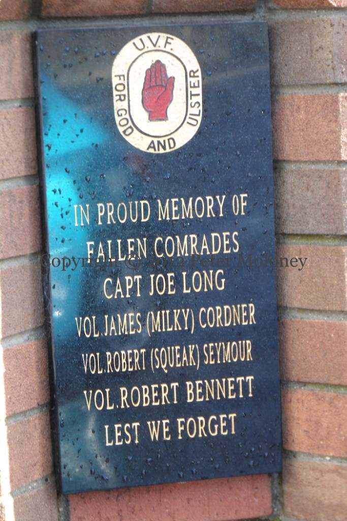“In proud memory of fallen comrades Capt Joe Long, Vol James (Milky) Cordner, Vol Robert (Squeak) Seymour, Vol Robert Bennett – lest we forget”. Seymour was shot dead by the (P)IRA (Sutton); James Cordner and Joseph Long were killed in a premature explosion (Balaclava St), and Robert Bennett was killed by the British Army during a riot (Sutton).