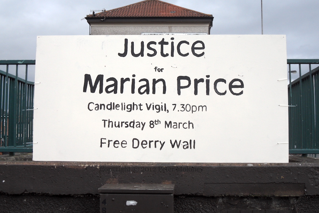 “Justice for Marian Price, Candlelight Vigil, 7.30 pm, Thursday 8th March, Free Derry Wall.” For background, see Free Marian Price.