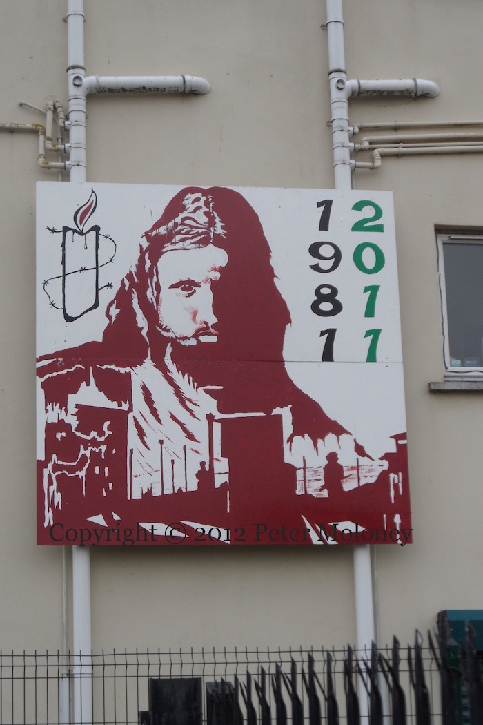 The Amnesty International symbol – a candle in barbed wire – is added to a thirtieth anniversary hunger strike mural in Melvin Road, Strabane. It’s not clear if there is any official connection. The rest of the image – a blanketman over the towers of Long Kesh – is the same as in murals in Derry and in Belfast.