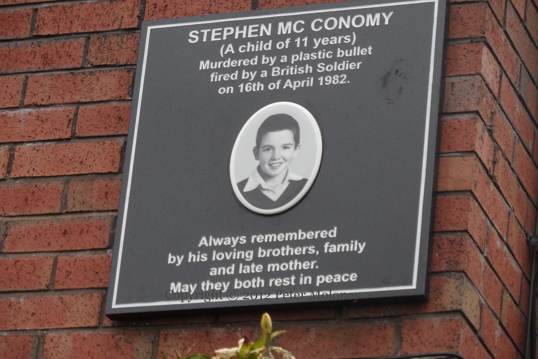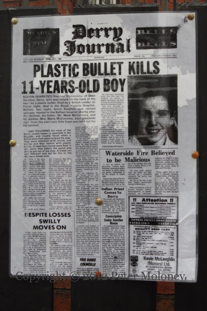 This is a new plaque to Stephen McConomy, killed by a plastic bullet in 1982 (for the previous plaque, see M03363) along with (on the fence below) a reproduction of the front page of the Derry Journal that announced his death.