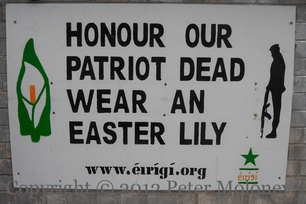 “Honour our patriot dead – wear an Easter lily”. “Political status for republican prisoners – www.éırígí.org“. These are two small boards below the advertising hoarding at the junction of Northumberland Street and the Falls Road, Belfast. The web address only works with the fadas removed.