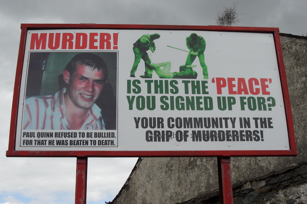 “Murder! Paul Quinn refused to be bullied for that he was beaten to death. Is this the ‘peace’ you signed up for? Your community in the grip of murderers!” Paul Quinn, from Cullyhanna, was beaten to death in 2007 by a group of about ten men at a County Monaghan farm, in what is thought by the family to have been a dispute with the local (South Armagh) IRA (WP).
