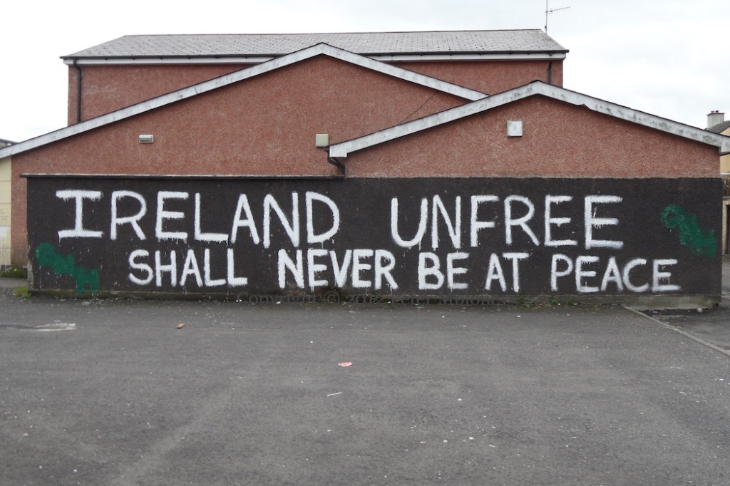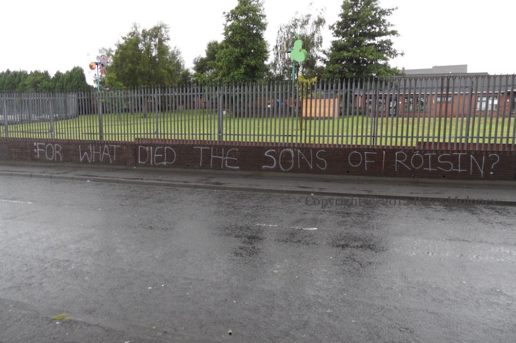 Two piece of graffiti along Central Drive, Creggan, Derry. The first – painted by the anti-Agreement group ONH/Óglaıgh Na hÉıreann – is of the closing words of Pearse’s oration at the funeral of O’Donovan Rossa on August 1st, 1915: “Ireland unfree shall never be at peace”; the second is from Luke Kelly’s poem For What Died The Sons Of Róısín? (youtube | mudcat)