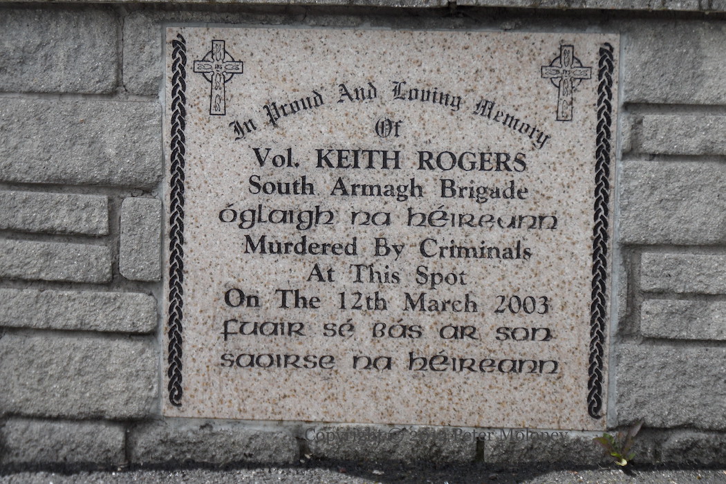 “In proud and loving memory of Vol. Keith Rogers, South Armagh Brigade, Óglaıgh Na hÉıreann, murdered by criminals at this spot on the 12th March, 2003. Fuaır sé bás ar son saoırse na hÉıreann.” Rogers, from Louth, was not an active duty when he was killed (An Phoblacht).