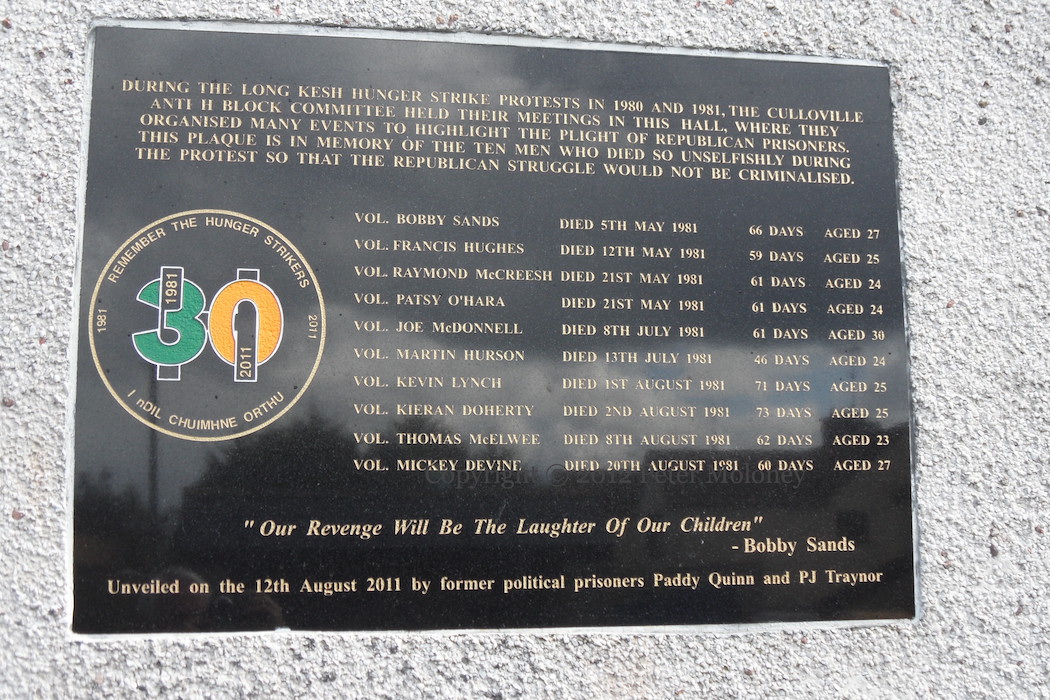“During the Long Kesh hunger strike protests in 1980 and 1981, the Culloville Anti H Block Committee held their meetings in this hall, where they organised many events to highlight the plight of republican prisoners. This plaque is in memory of the ten men who died so unselfishly during the protest so that the republican struggle would not be criminalised. ‘Our revenge will be the laughter of our children’ – Bobby Sands. Unveiled on the 12th August 2011 by former political prisoners Paddy Quinn and PJ Traynor.”