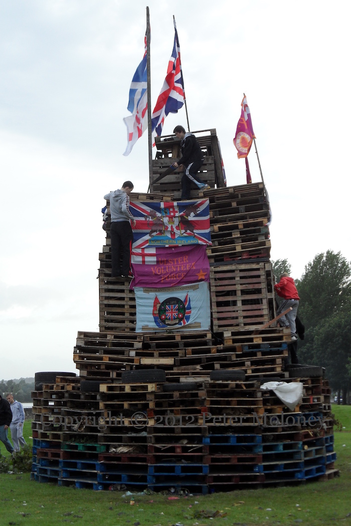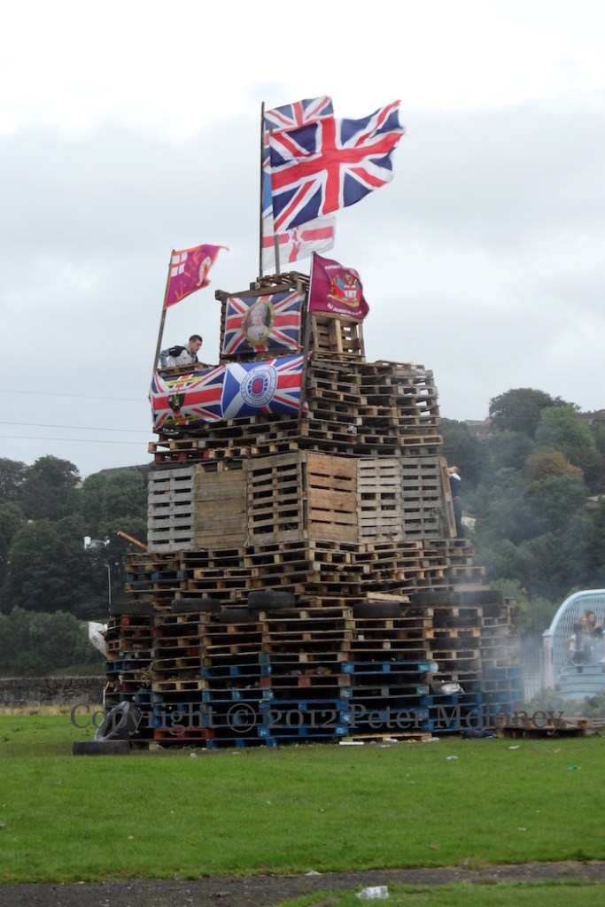 The August bonfire in Foyleside, now with even more stolen flags – mostly UVF but there is one North Antrim & Londonderry UDU flag – compared to 2009.