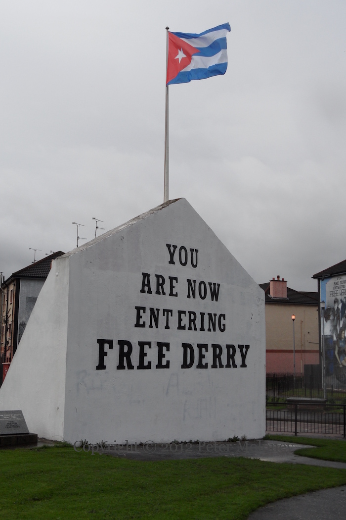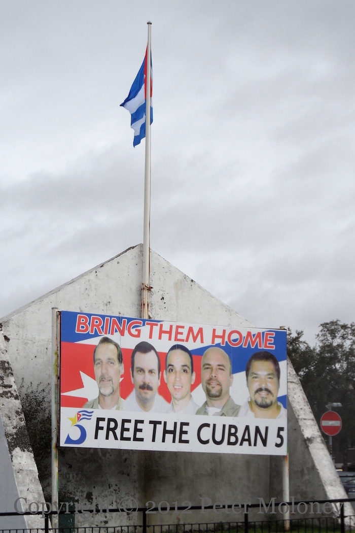 “Bring them home – free the Cuban 5”. Free Derry Corner flies the Cuban flag in support of the “Cuban 5”. The five were Gerardo Hernández, Antonio Guerrero, Ramón Labañino, Fernando González, and René González, intelligence agents arrested in 1998 and accused of spying on the US; the Cuban government said they were in the US to infiltrate the Cuban exile community. Their convictions were overturned by a Circuit panel but upheld by the full court (WP).