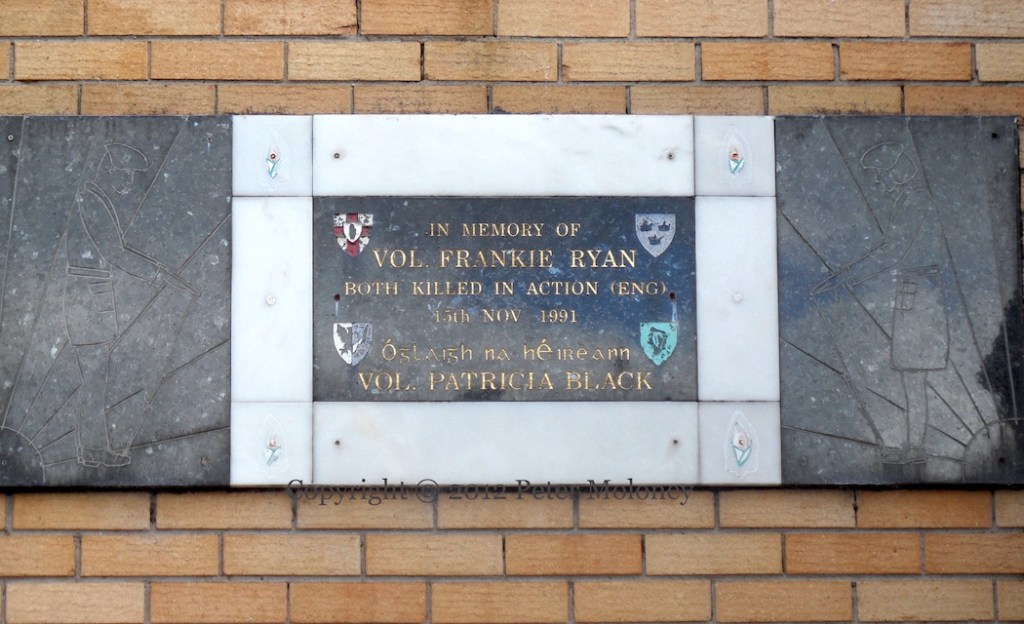 “In memory of Vol. Frankie Ryan, Vol. Patricia Black, Óglaigh Na hÉireann, both killed in action (Eng) 15th Nov. 1991.” The pair were killed by a premature bomb explosion St Albans in Hertfordshire, England. Their target was the British Army military band, which was scheduled to play in the town centre (QURC).
