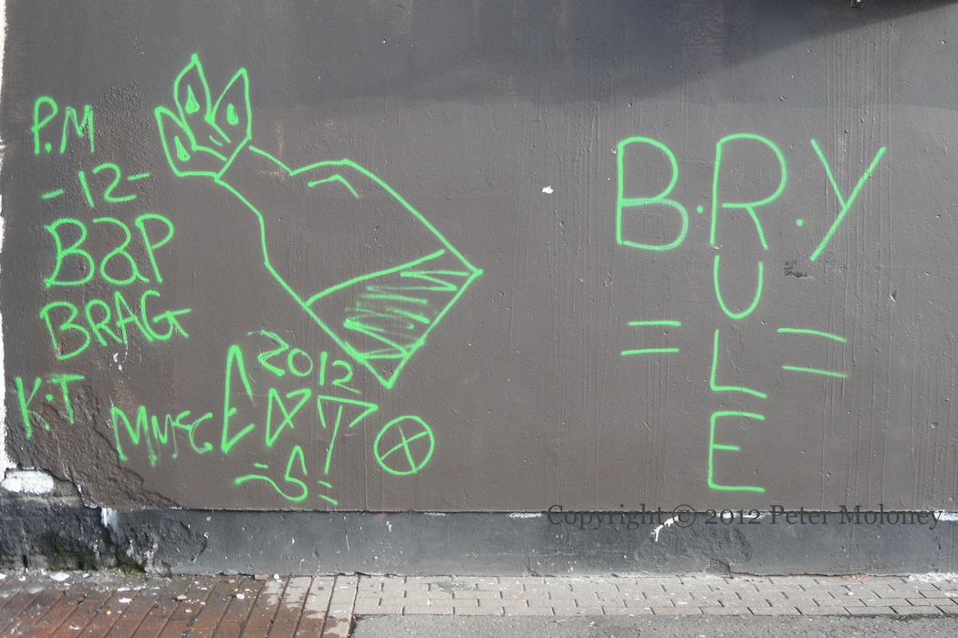 “BRAG” is “Bogside Republican Action Group” and “BRY” is “Bogside Republican Youth”; the rest of the writing seems to be initials/signatures. See previously: BRY Petrol Bombers. (The petrol bomb was long ago a symbol of Ógra Shınn Féın (J2182).)
