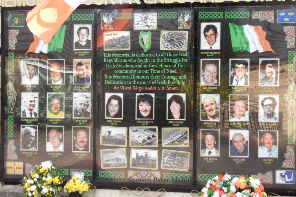 “In memory of our friends and comrades. This Memorial is dedicated to all those Irish Republicans who fought in the Struggle for Irish Freedom, and in the defence of this community in our Time of Need. This Memorial honours their Courage and Dedication to the cause of Irish Freedom. Ar dheıs Dé go raıbh a n-anam.” Hugo Wilkinson, Terry Murphy, Paul Watson, Jim McLaughlin, Richard McIlkenny, Jake McGowan, Patsy Quinn, Liam Mulholland, Francis O’Neill, Sean Delaney, Carmel Cahoon, Christine Beattie, Geraldine Rice, Anthony McIlkenny, Joey Saunders, Danny Mullan, Tony Molloy, Seamus Rice, Eamon McAllister, Gerry McAllister, John Bateson, John Barnes, Jim Floyd. With images of the prisons Armagh, Long Kesh H-Blocks, Magilligan, Long Kesh cages, HMS Maidstone, Portlaoise, Wormwood Scubs, Crumlin Road.