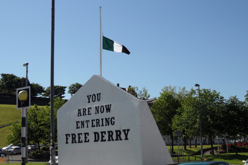 Free Derry 2013-06-072025-02-24Extramural Activity Free Derry Corner flying a green, white, and black flag. Get in touch if you know its significance. Click image to enlargeCopyright © 2013 Peter MoloneyM09633 Share this: Share on X (Opens in new window) X Share on Facebook (Opens in new window) Facebook Like Loading... Related