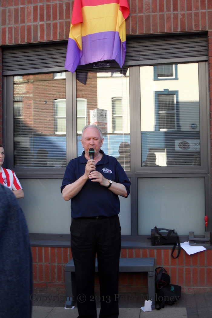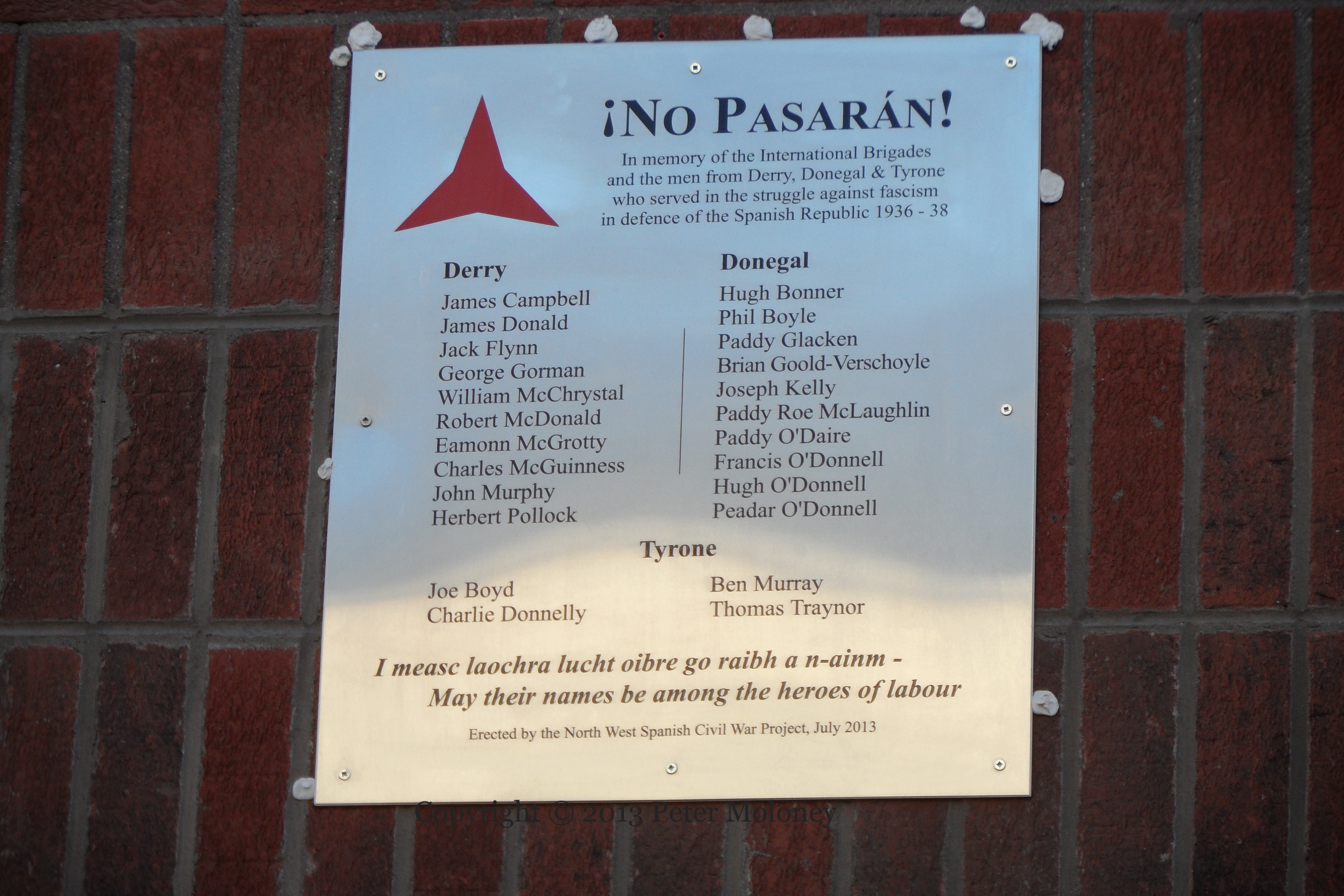 “¡No pasarán! In memory of the International Brigades and the men from Derry, Donegal & Tyrone who served in the struggle against fascism in defence of the Spanish Republic 1936 – 38. I measc laochra lucht oıbre go raıbh a n-aınm – May their names [name] be among the heroes of labour. Erected by the North West Spanish Civil War Project, July 2013.”