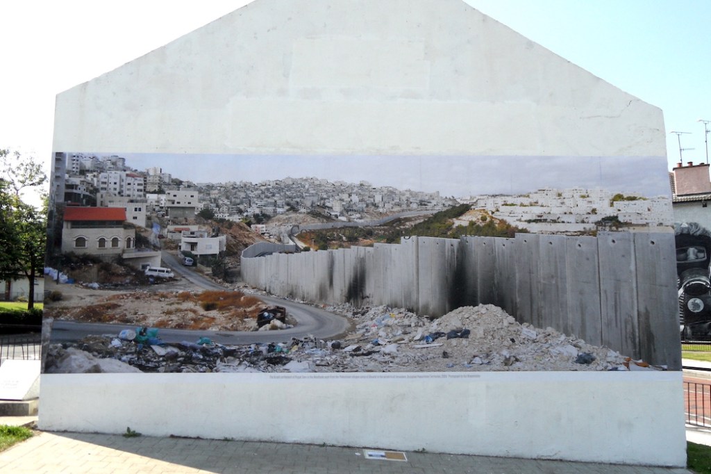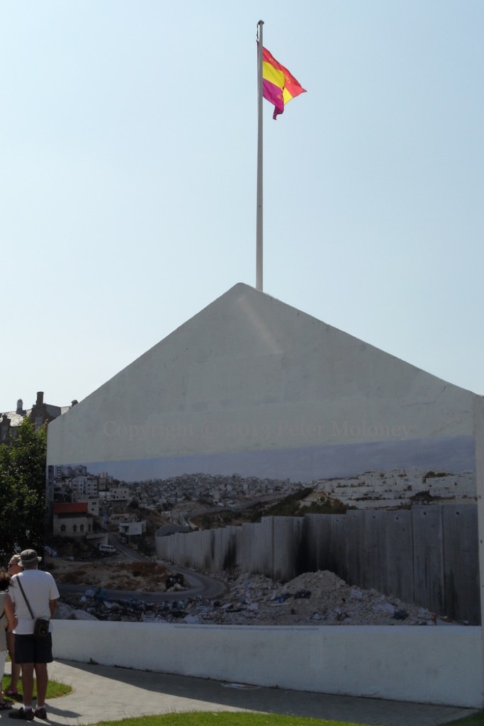 “The Israeli settlement of Pisgat Zeev in the Westbank seen from the Palestinian refugee camp of Shuafat in the outskirts of Jeruslaem. Occupied Palestinian Terriitories, 2009. Photograph by Kai Wiedenhöfer.” Wiedenhöfer’s photograph was mounted on Free Derry Corner July 19-21, 2013, as an extension of the Wall On Wall project and as one of the events during Derry’s year as the first “UK City Of Culture”. (Interview and footage of the piece being mounted can be seen at youtube.)