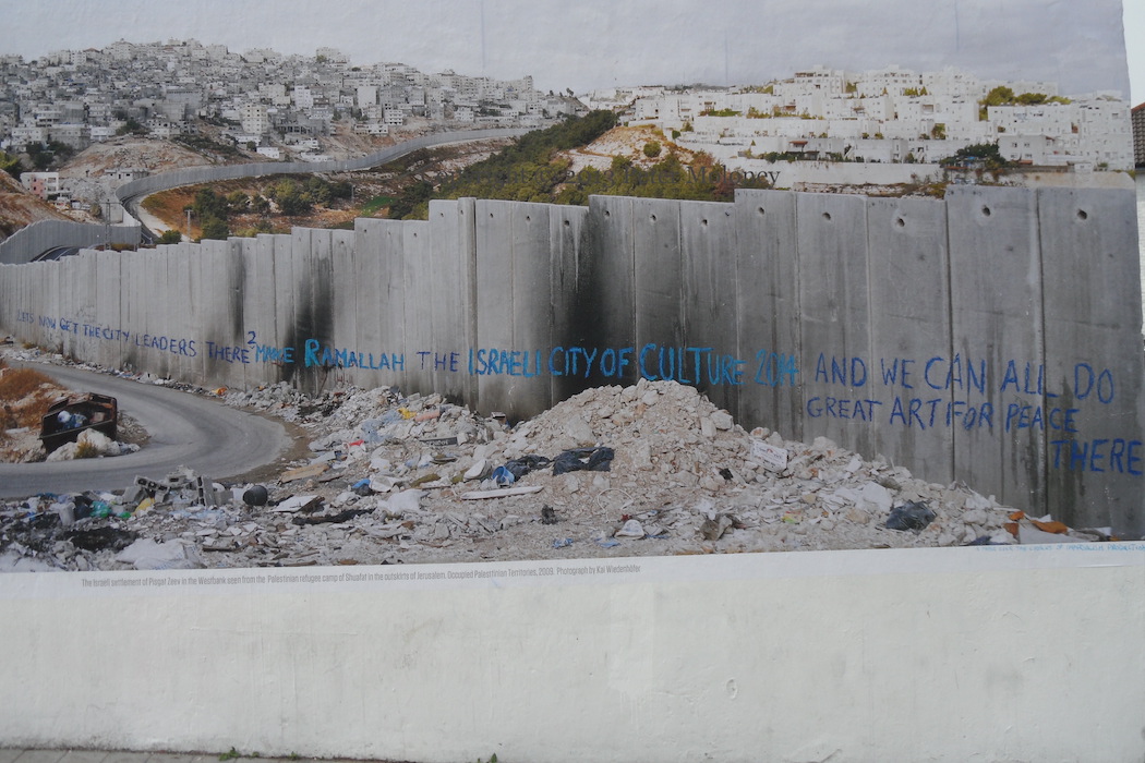 The final two images show graffiti added as though part of the design of the piece: on the wall in the photo, “Let’s now get the city leaders there 2 make Ramallah the Israeli city of culture 2014 and we can all do great art for peace there” and in the bottom corner, “A paper over the cracks of imperialism production.”