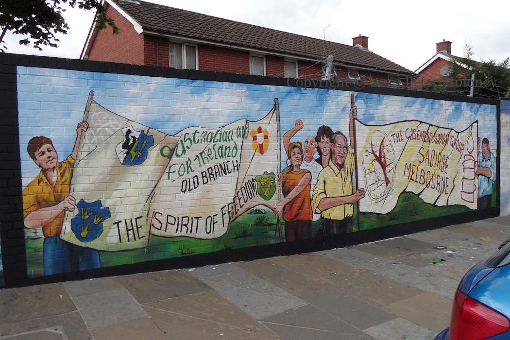 This Conway Street mural, outside the mill and the republican museum, features banners of two Australian republican support-groups, with supporters holding banners reading “Australian Aid for Ireland QLD [Queensland] Branch [Fb] – The Spirit of Freedom” and “The Casement Support Group – Saoirse Melbourne”.
