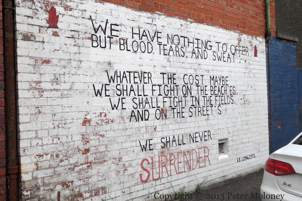 A message from “E.B. [east Belfast] Loyalists” in Castlereagh Parade, combining two speeches of Winston Churchill’s: We have nothing to offer but blood, tears, and sweat. Whatever the cost maybe, we shall fight on the beach’es, we shall fight in the fields and on the street’s. We shall never surrender.”