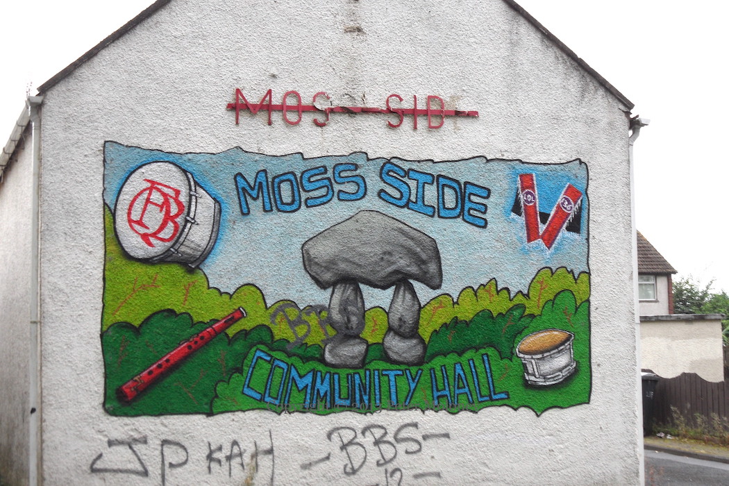 “Moss side” is probably Scots, with “moss” meaning “marsh” or “(peat) bog” (DSL) and this mural is appropriately on Ballybog Road (in Dunmurry), “bog(ach)” in Irish meaning “soft (ground)..