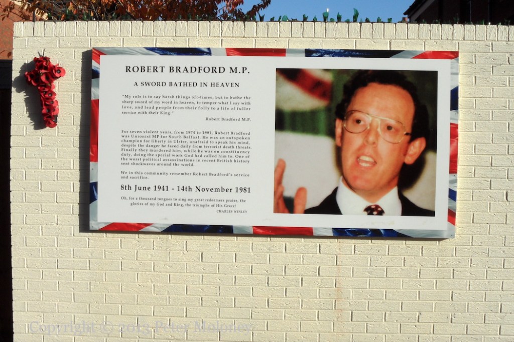 South Belfast MP Robert Bradford was assassinated by the Provisional IRA in Finaghy at a meeting with constituents; the caretaker of the community centre, Ken Campbell, was also killed by the fleeing attackers. Taking place in late 1981, with the hunger strikes having ended only a month before, the killing was noted around the world and raised fears of broad civil unrest (BBC | NYTimes). The board immediately above replaces an earlier mural to Bradford on the gable wall that now hosts the large board shown above, commemorating the Siege Of Derry and specifically the “Apprentice Boys Of Derry No Surrender Club” of south Belfast.