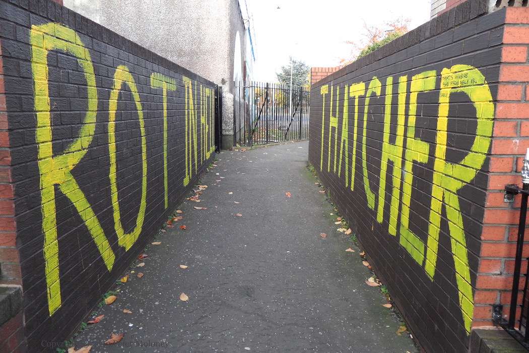 Reaction to the death (on Monday, April 8th) of Margaret Thatcher, U.K. Prime Minister 1979-1990 (WP), in an alley below Divis tower, between Divis Street and Clonfaddan Crescent.